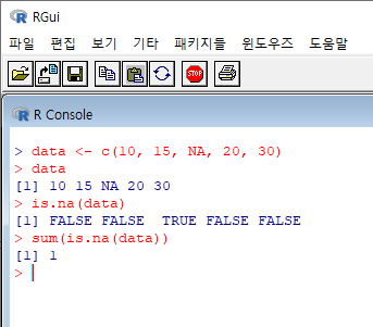 - is.na(): 데이터의 각 값이 결측값(NA)인지 확인하는 함수. TRUE는 결측값, FALSE는 정상값을 의미한다.