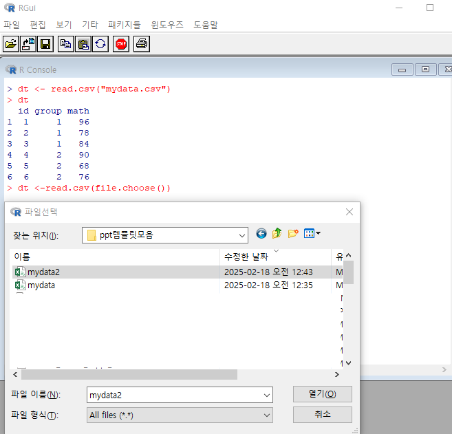 🔥TIP: 만약 파일이 작업 디렉토리에 없다면 전체 경로를 지정하거나 file.choose()로 파일을 직접 선택할 수 있다