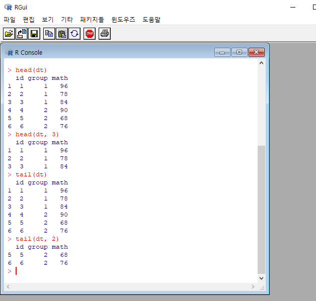 | tail() | 데이터의 마지막 6개 행 출력 |