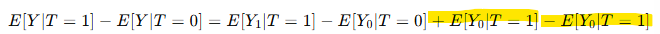 편향을 이해하기 위해 E[Y0|T=1] (처치를 받은 사람들이 처치를 받지 않았을 경우의 기대값)을 더하고 빼주자.