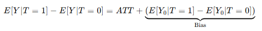 Bias는 처치를 받지 않았을 때(Y0)의 기대 결과가 처치군(T=1)과 비처치군(T=0)에서 다를 경우 발생한다