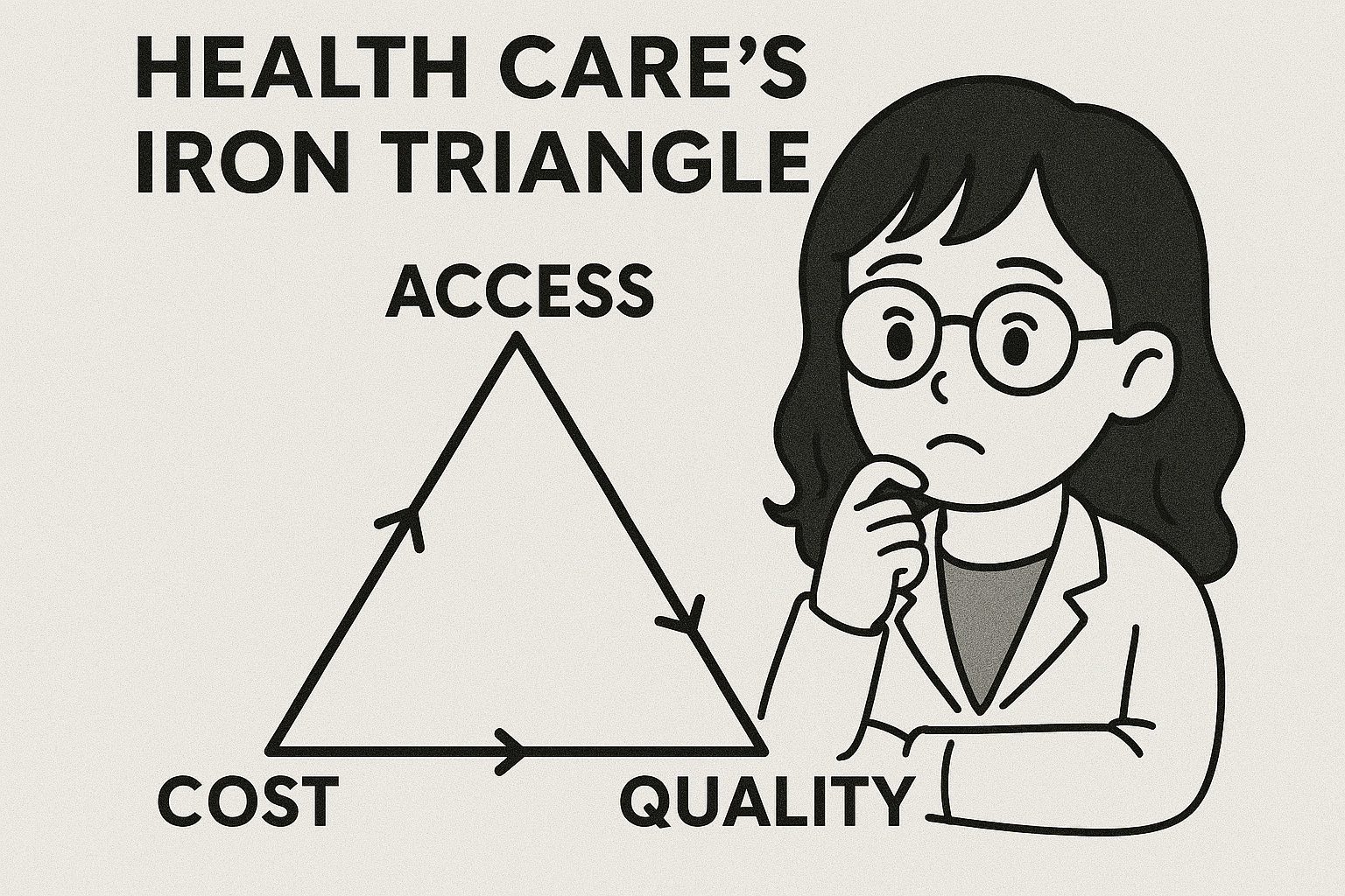 Health Care’s Iron Triangle์ ํ์ค์์ ์ธ ๊ฐ์ง ๋ชฉํ(๋น์ฉ ์ ๊ฐ, ์ ๊ทผ์ฑ ํฅ์, ์๋ฃ ์ง ๊ฐ์ )๋ฅผ ๋์์ ๋ง์กฑ์ํค๊ธฐ ์ด๋ ต๋ค๋ ๊ตฌ์กฐ์ ํ๊ณ๋ฅผ ์ค๋ช