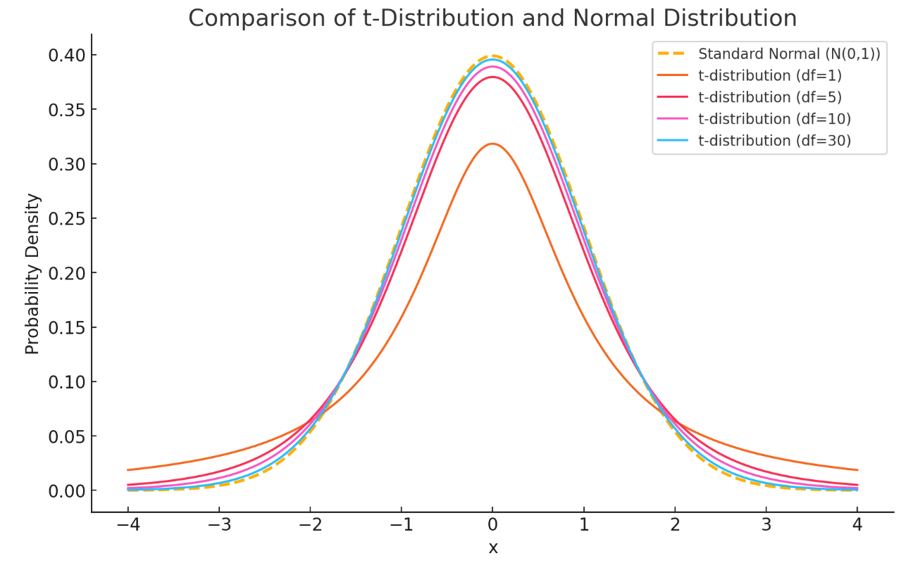 ✔ 자유도가 낮을수록 t-분포의 꼬리가 두껍고, 자유도가 높으면 정규분포와 비슷해진다