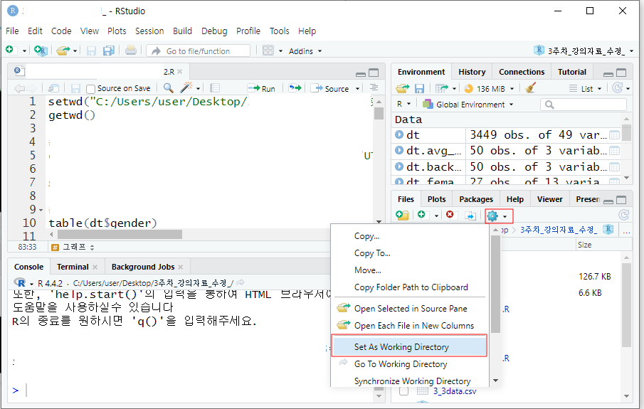R에서 데이터를 불러오려면, 작업 경로(Working Directory)를 정확히 설정해야 한다.