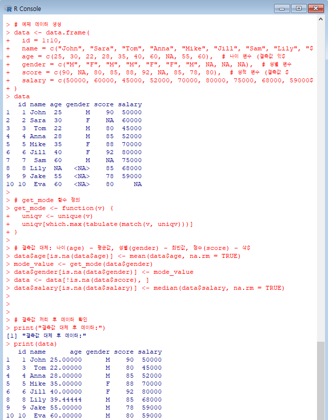 데이터 분석에서 결측값(missing values)은 자주 마주치는 문제다.결측값은 데이터에 값이 없는 경우를 의미하며, 데이터를 처리하는 과정에서 반드시 해결해야 하는 중요한 부분이다. R에서는 결측값을 NA로 표시한다.NA는 Not Available을 의미하며, R의 모든 기본 연산에서 특별한 값으로 취급된다.결측값을 처리할 때는 NA를 다루는 방법을 알아야 한다. 이번 포스팅에서는 R에서 결측값을 처리하는 방법에 대해 다루며, 결측값을 삭제하거나 대체하는 기본적인 방법을 소개한다.결측값 처리 방법 (삭제, 대체 등)결측값을 처리하는 주요 방법은 두 가지:결측값 삭제: 데이터셋에서 결측값을 포함하는 행(row) 또는 열(column)을 삭제하는 방법이다. 이 방법은 결측값이 적고, 삭제해도 데이터에 ..